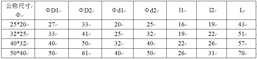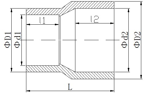 其中“ΦD1”表示管件小头公称外径,“Φd1”表示管件小头公称内径,“L”管件长度,“l1”表示管件小头承插口长度,“Φd2”表示管件大头公称内径,“ΦD2”管件大头公称外径,“l2”表示管件大头承插口长度,1.0MPa=10公斤