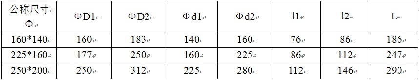 其中“ΦD1”表示管件小头公称外径,“Φd1”表示管件小头公称内径,“L”管件长度,“l1”表示管件小头承插口长度,“Φd2”表示管件大头公称内径,“ΦD2”管件大头公称外径,“l2”表示管件大头承插口长度,1.0MPa=10公斤